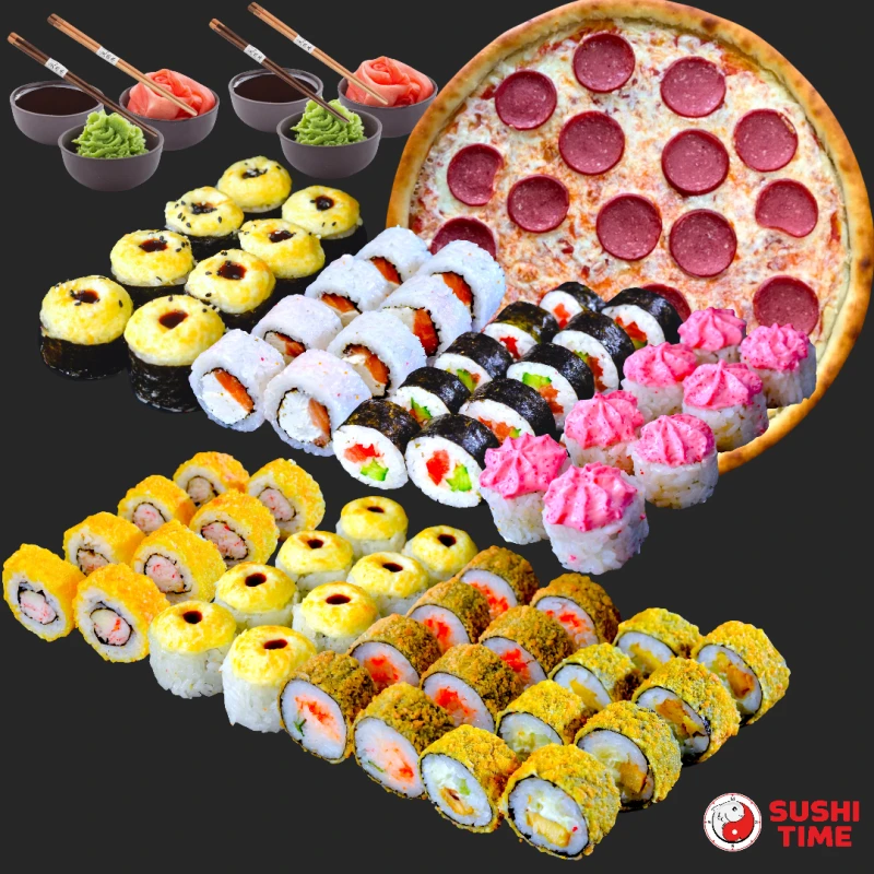 САЛМОН ФИЛАДЕЛЬФИЯ 8шт ФУТОМАКИ ЯСАЙ 10 ШТ ЛАВА С КРАБОМ 8шт ОН САМЫЙ НЕЖНЫЙ 8шт ТОРИ ЯКИ 8шт МУРАКАМИ ТЕМПУРА 8шт КРАБ ФРИ 8шт КАЛИФОРНИЯ ТЕМПУРА 8шт Пицца пепперони 30 см Соевый соус, имбирь, васаби, палочки и пакеты приобретается отдельно!