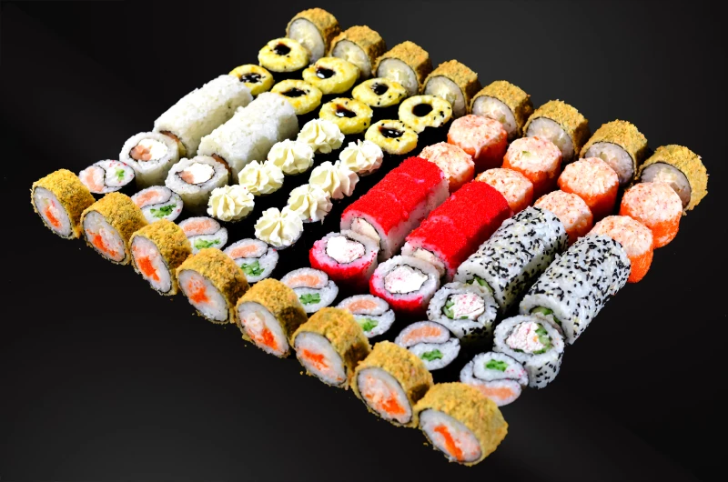 Инь Янь 8шт Камчатский 8шт Снежинка 8шт Калифорния каппа маки 8шт Салмон филадельфия 8шт Тайланд 8шт Тори Яки 8шт Чикен темпура 8шт Калифорния темпура 8шт Соевый соус, имбирь, васаби, палочки и пакеты приобретается отдельно!