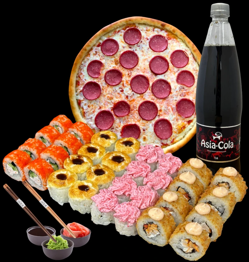 КАЛИФОРНИЯ С КРАБОМ 8шт НЕЖНЫЙ С КУРИЦЕЙ 8шт ЛАВА С ЛОСОСЕМ 8шт ЧИКЕН ТЕМПУРА ЛЮКС 8шт пицца ПЕППЕРОНИ 30см АЗИЯ КОЛА 1л Соевый соус, имбирь, васаби, палочки и пакеты приобретается отдельно!
